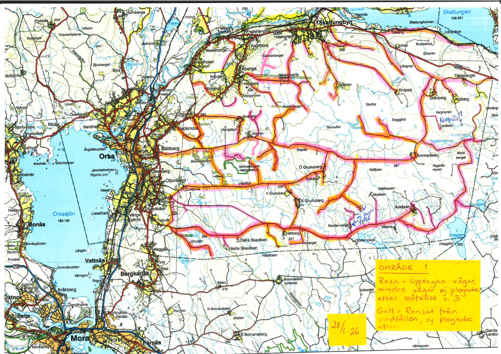 Planen är att vi öppnar alla jordägarvägar inom Siljansringen ”öst på skogen” som första område (område 1 på kartan). Vägar som ingår i Orsa Åtkomstvägar samfällighetsförening inkluderas. Klass 1 och 2-vägar kommer att hållas öppna under hela vintern oavsett vilket område de ligger i. Vi kommer att öppna upp område 2 och 3 eftersom. Håll dig uppdaterad i listan här nedan. Vänligen meddela oss om ni ska utföra skogsåtgärder längs upptagna vägar för fortsatt snöröjning.