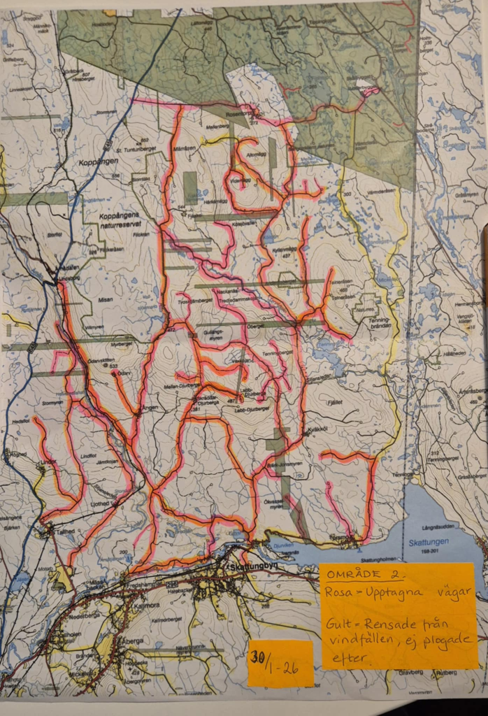 Mot bakgrund av de stora vindfällena i vissa områden har vi nu beslutat att även snöröja delar av jordägarvägnätet som normalt inte plogas vintertid. Syftet är att skapa bättre förutsättningar för delägare att ta sig ut och se över sina innehav samt att underlätta arbetet med att ta tillvara stormfällt virke. En tidigare liknande insats genomfördes vid stora snöskador för några år sedan och gav då god effekt.
